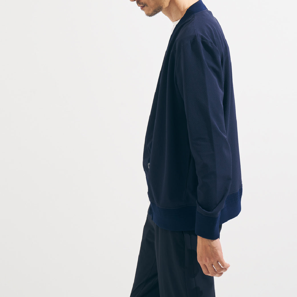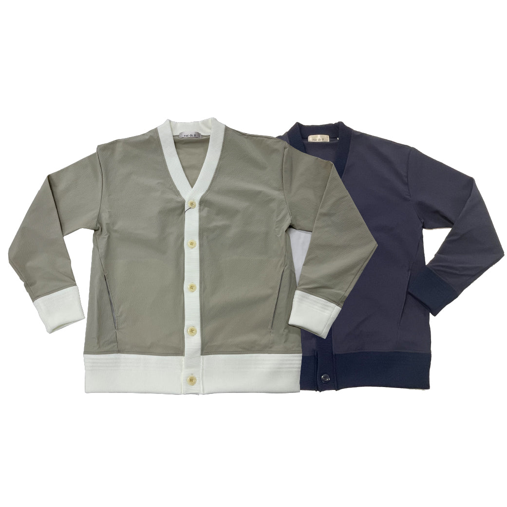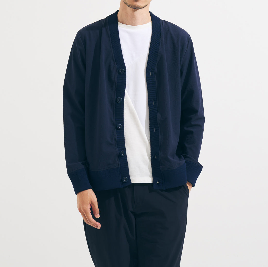 ①2WAYストレッチ ②吸水速乾 ③UVカット ④防シワ ⑤ウォッシャブルと様々な機能を併せ持った、ハイスペックな主素材を使用したVネックカーディガン。