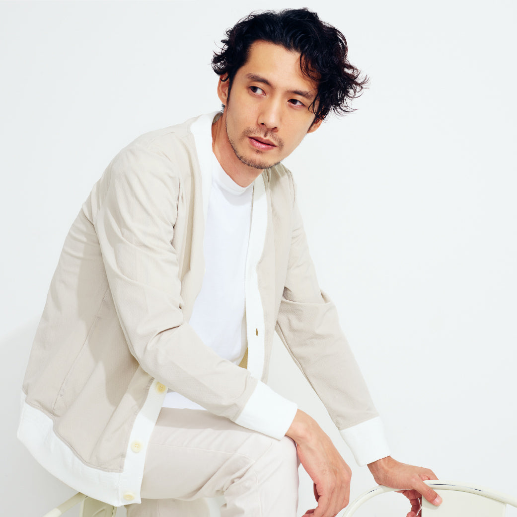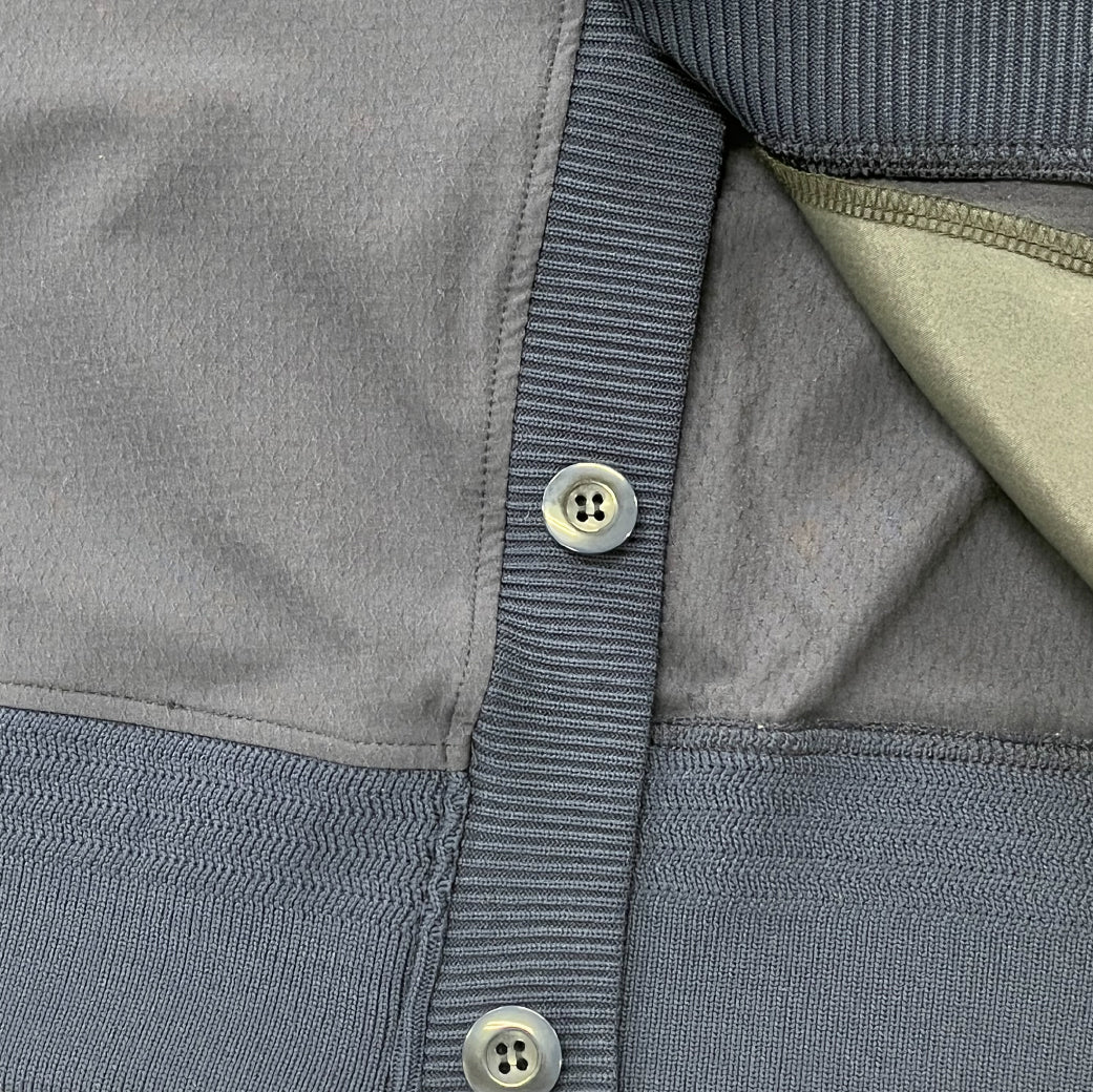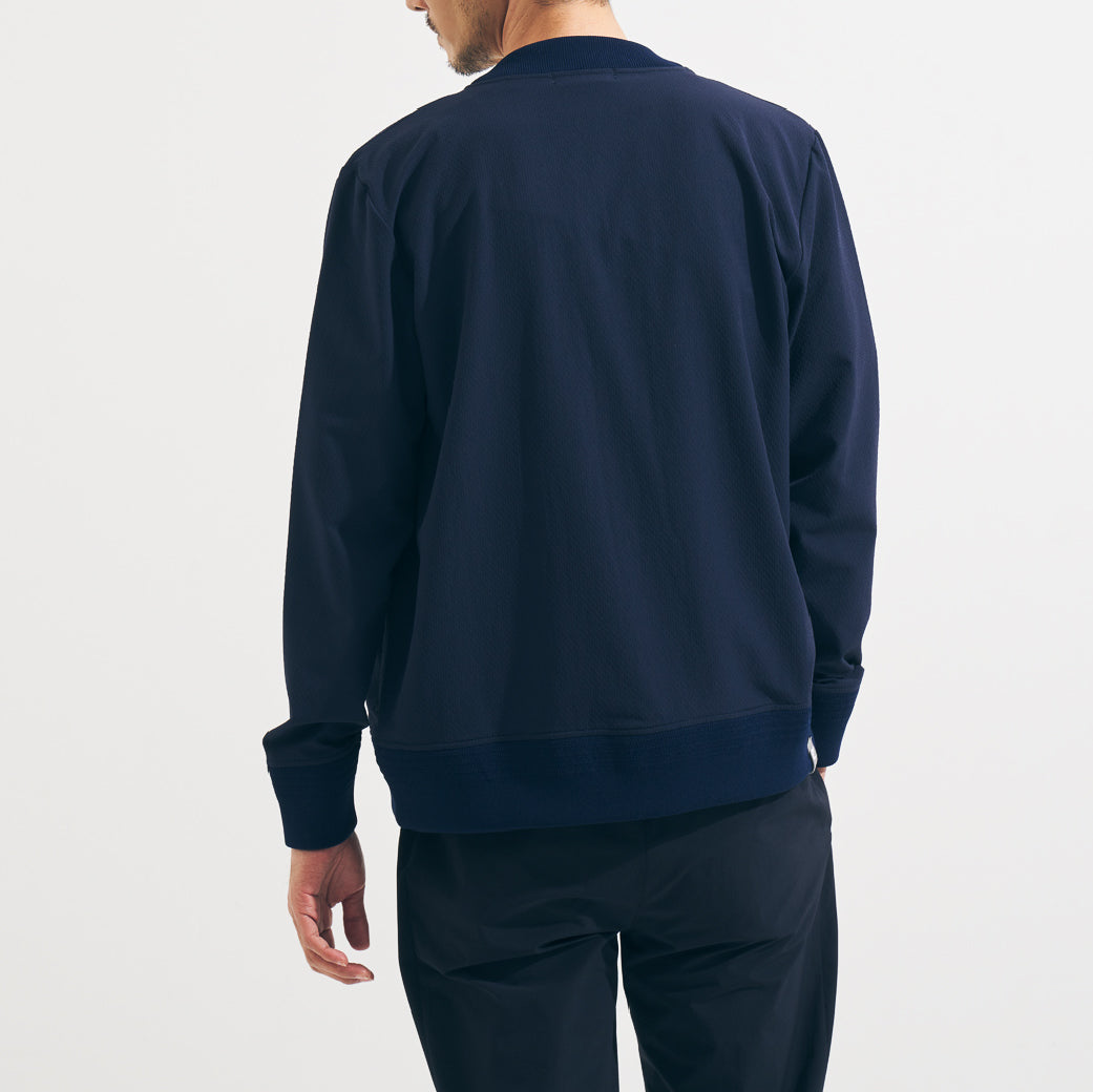 ①2WAYストレッチ ②吸水速乾 ③UVカット ④防シワ ⑤ウォッシャブルと様々な機能を併せ持った、ハイスペックな主素材を使用したVネックカーディガン。