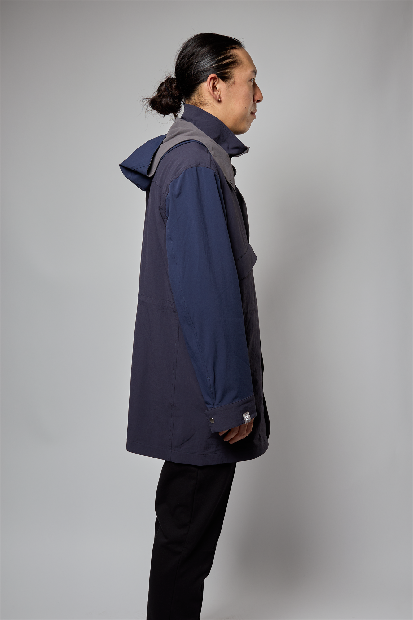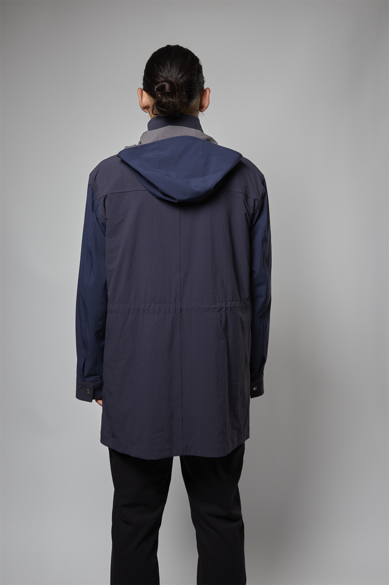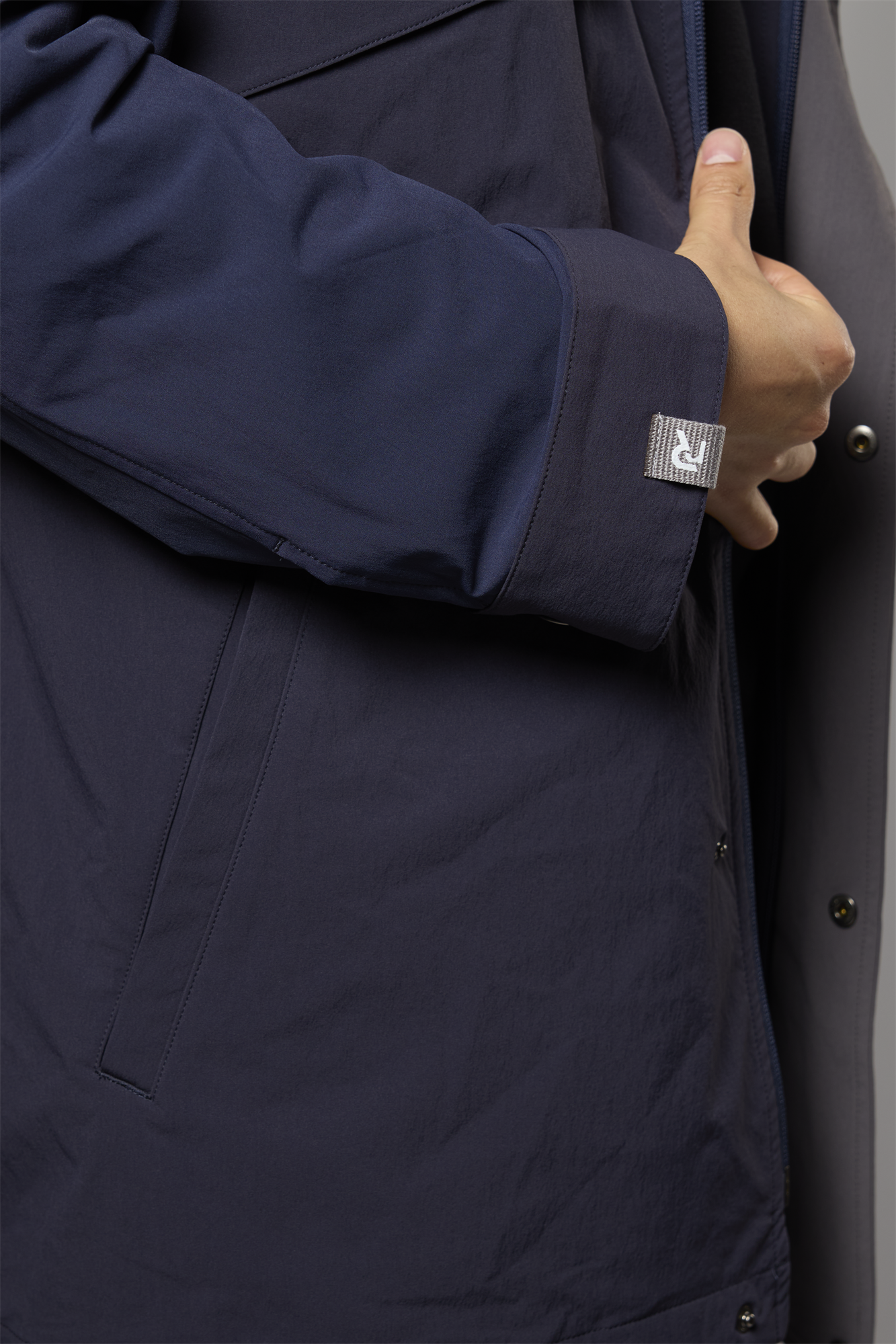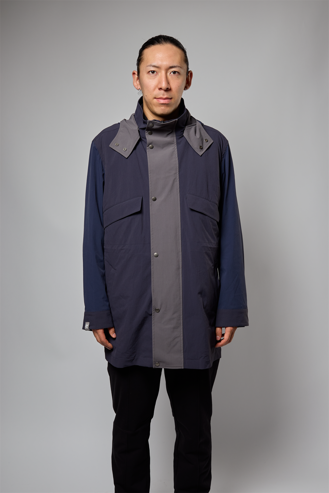 表地の素材は薄手で軽く、さらっとした肌触りが感じられます。また、アウターアイテムには欠かせない、タテ・ヨコへの伸縮性に富んだストレッチ性と、撥水性といった機能が備わったコートです。