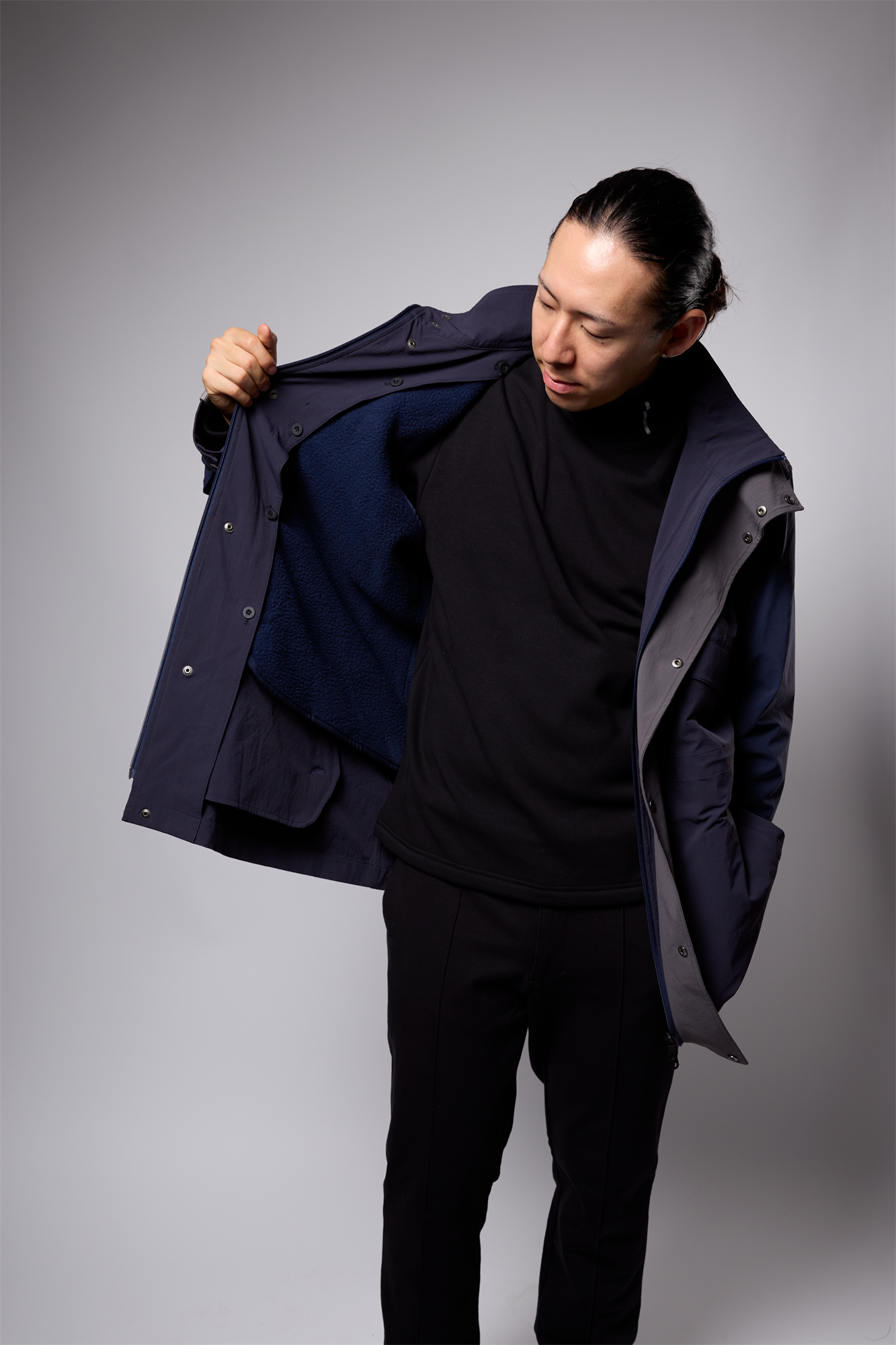 仕様面においては、アウトドア系のディテールに落とし込んだ、ボアフリースの脱着可能なライナーや、フードもドットボタンが着いており、取り外し可能である等、その日の気候・気温や気分によって様々な着こなしを楽しんでいただけるデザインとなっております。