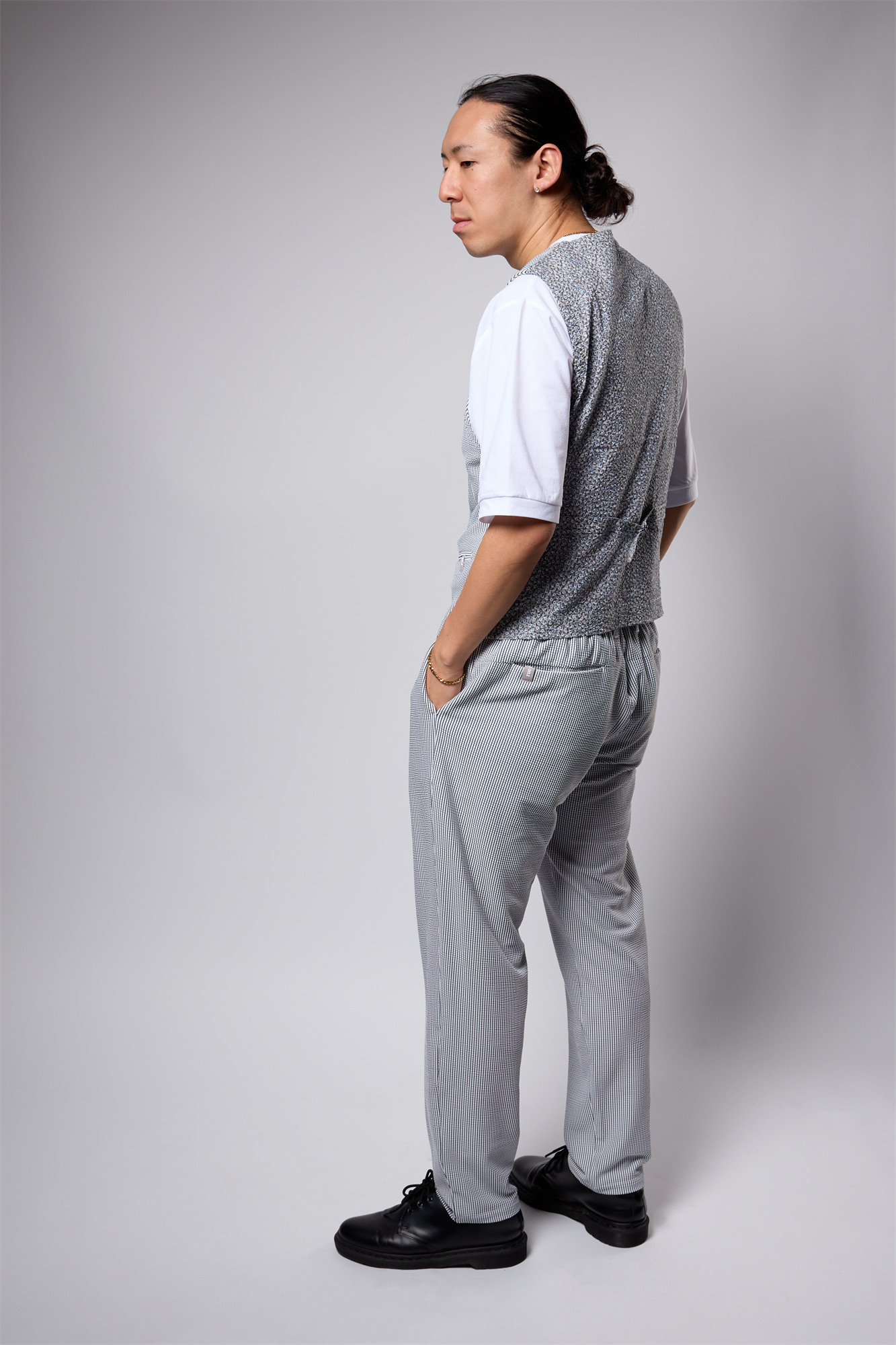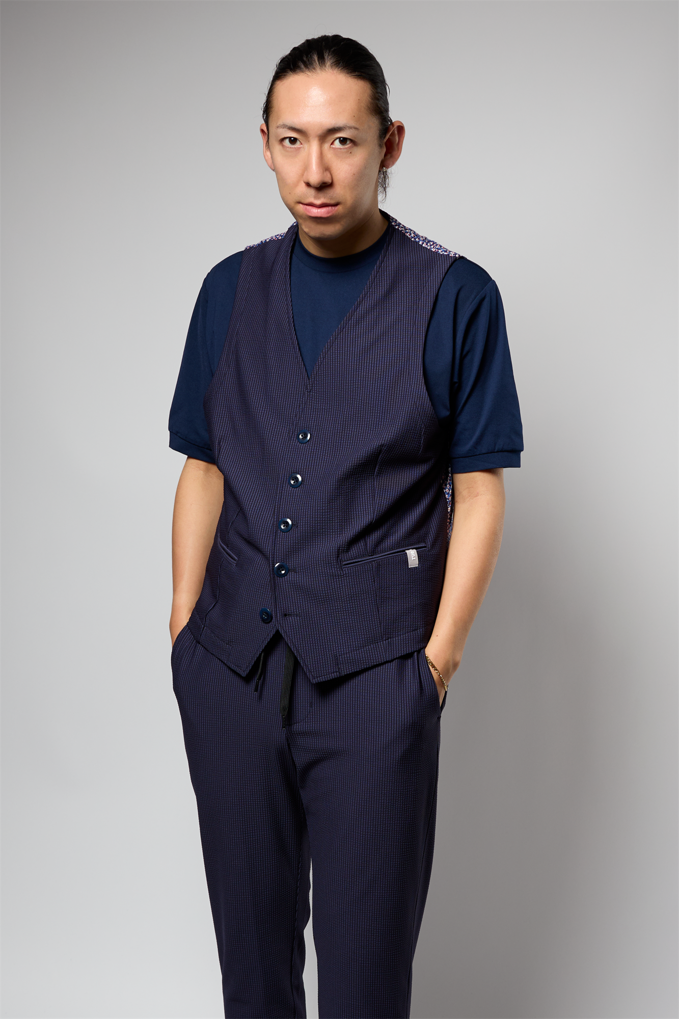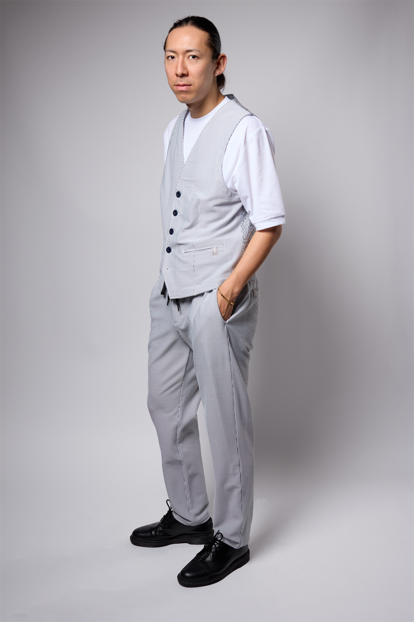 昨年好評のサッカー生地の新素材バージョンです。ストライプ柄を経縞で表現したメッシュ素材。生地表面サッカーの表情により清涼感があり、吸水速乾性にも優れた春夏むけ素材です。360度全方向に伸びるストレッチ性もあるので抜群の着心地を持っています。