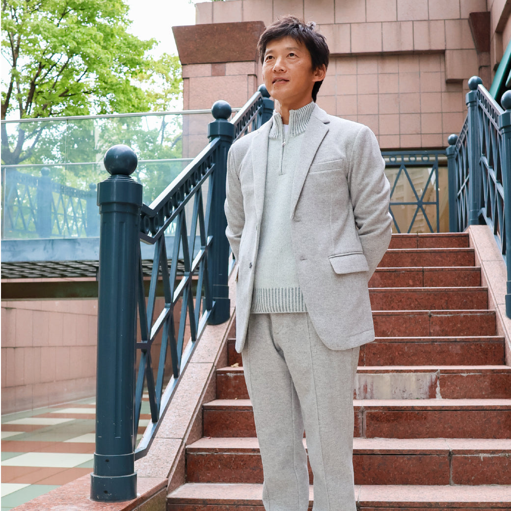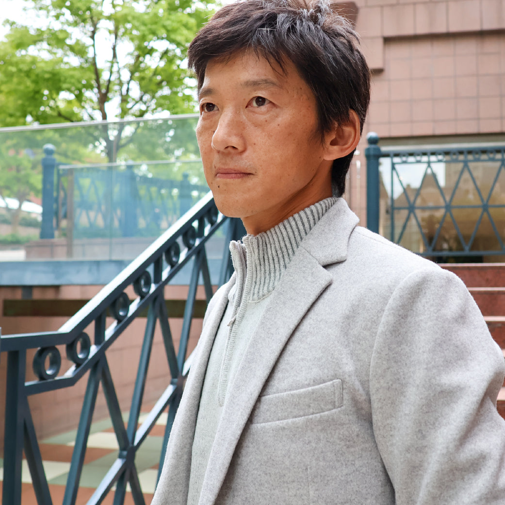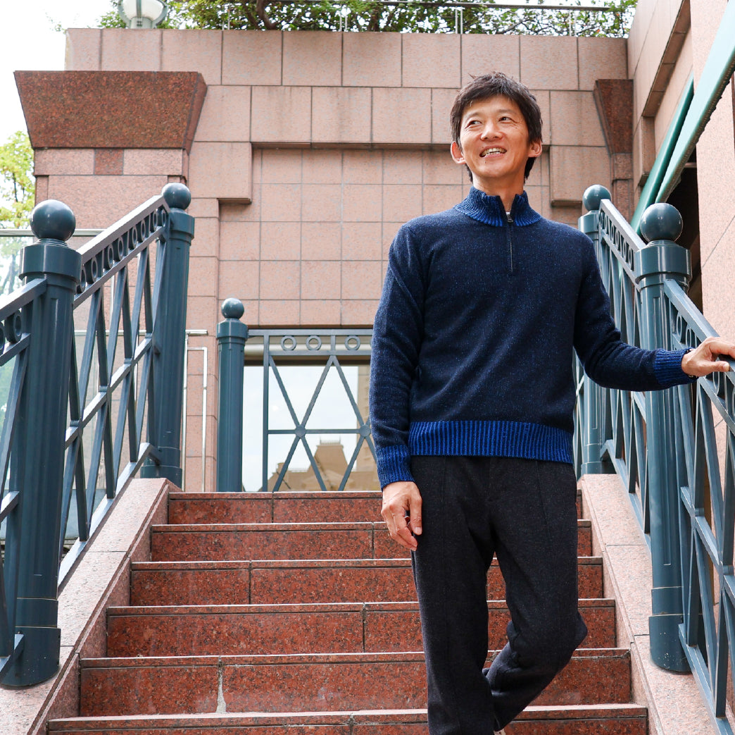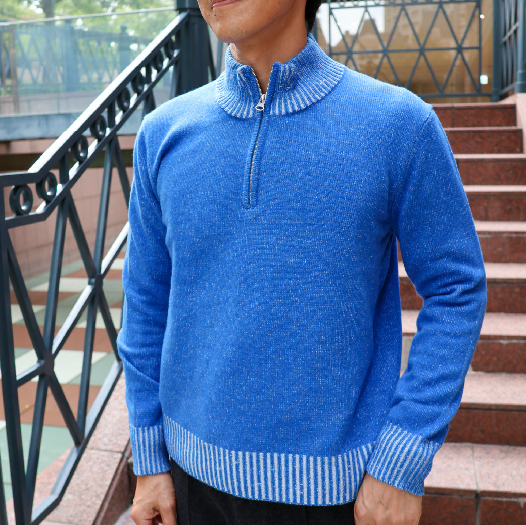 ファインメリノを半梳毛に紡績し、ふんわりと柔らかい風合と保温性を併せ持ったニットです。2色の糸を2重臼で編み、奥行きのある色合いになる様に配色しています。ZIPアップは体内に溜まった熱を素早く外に放出します。