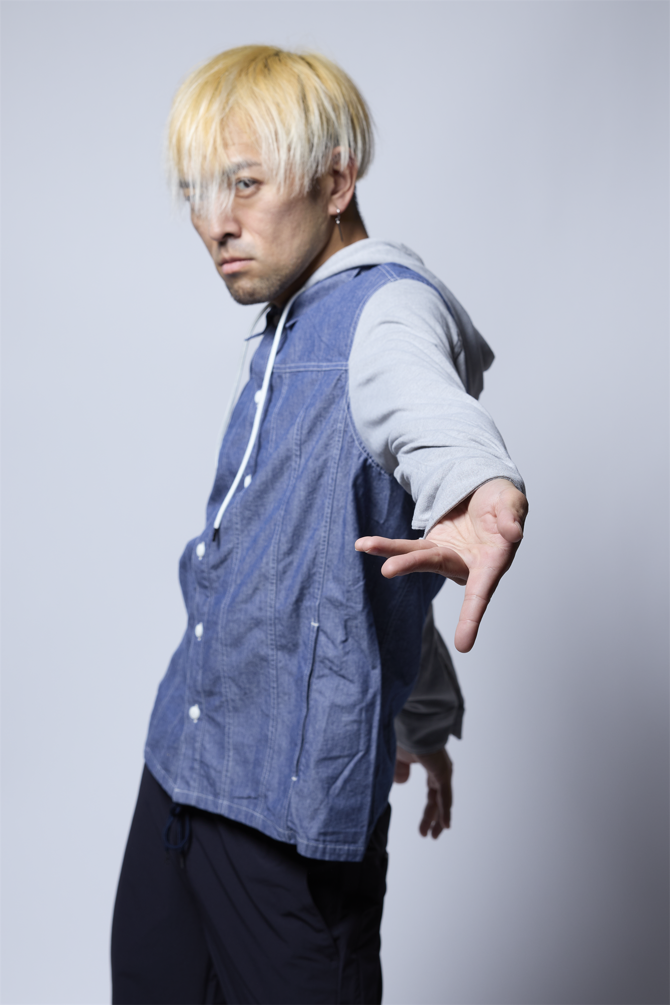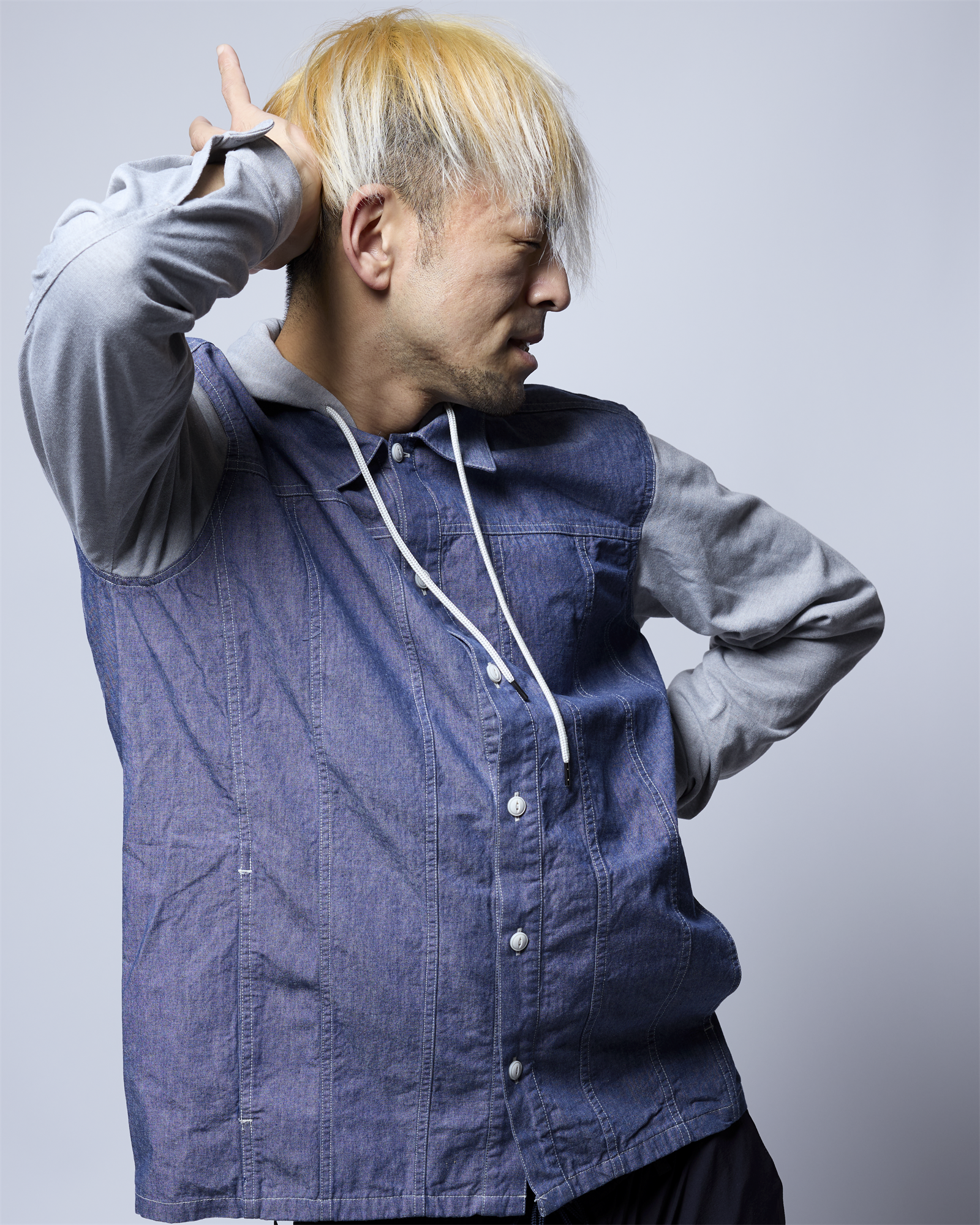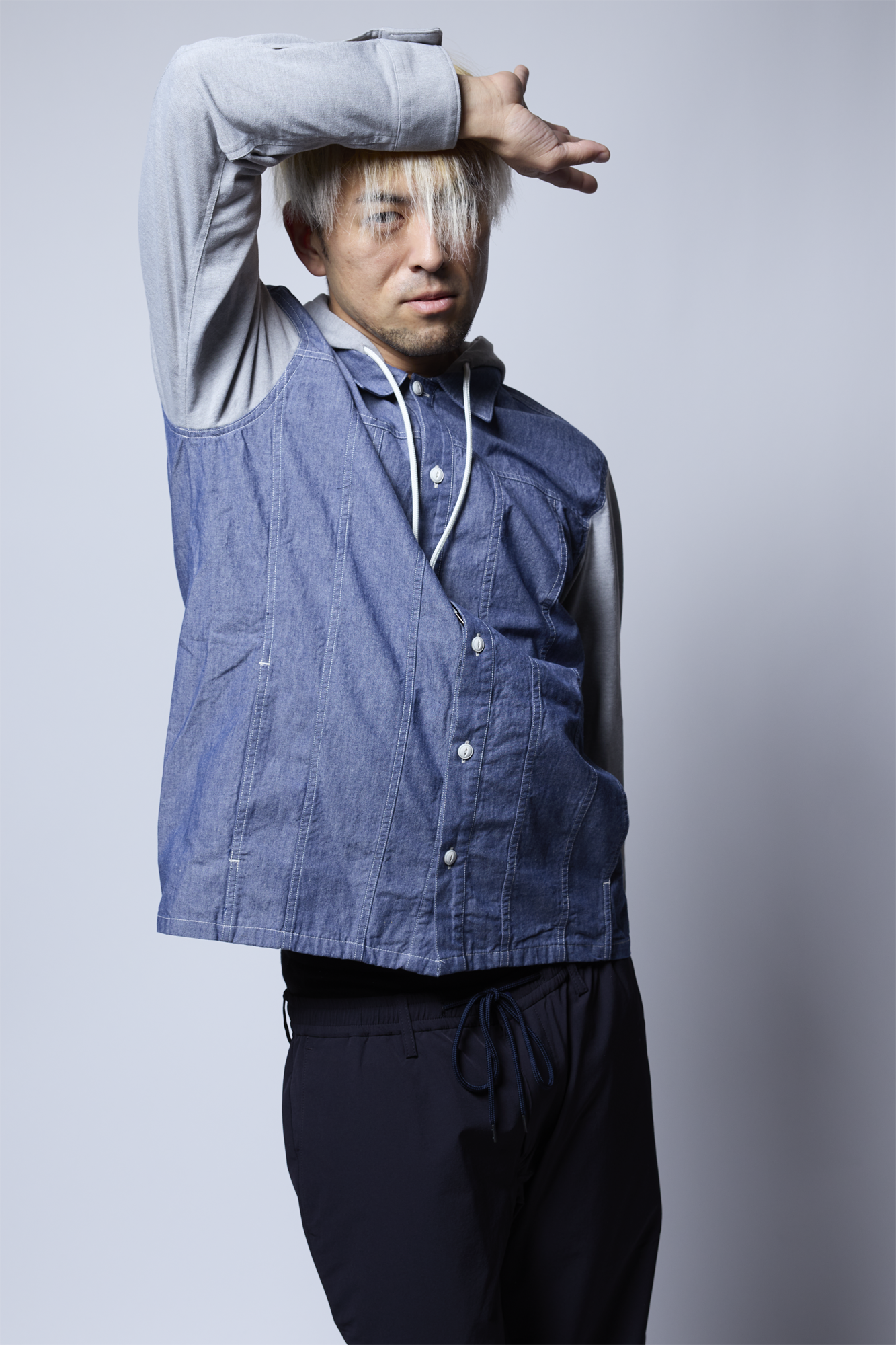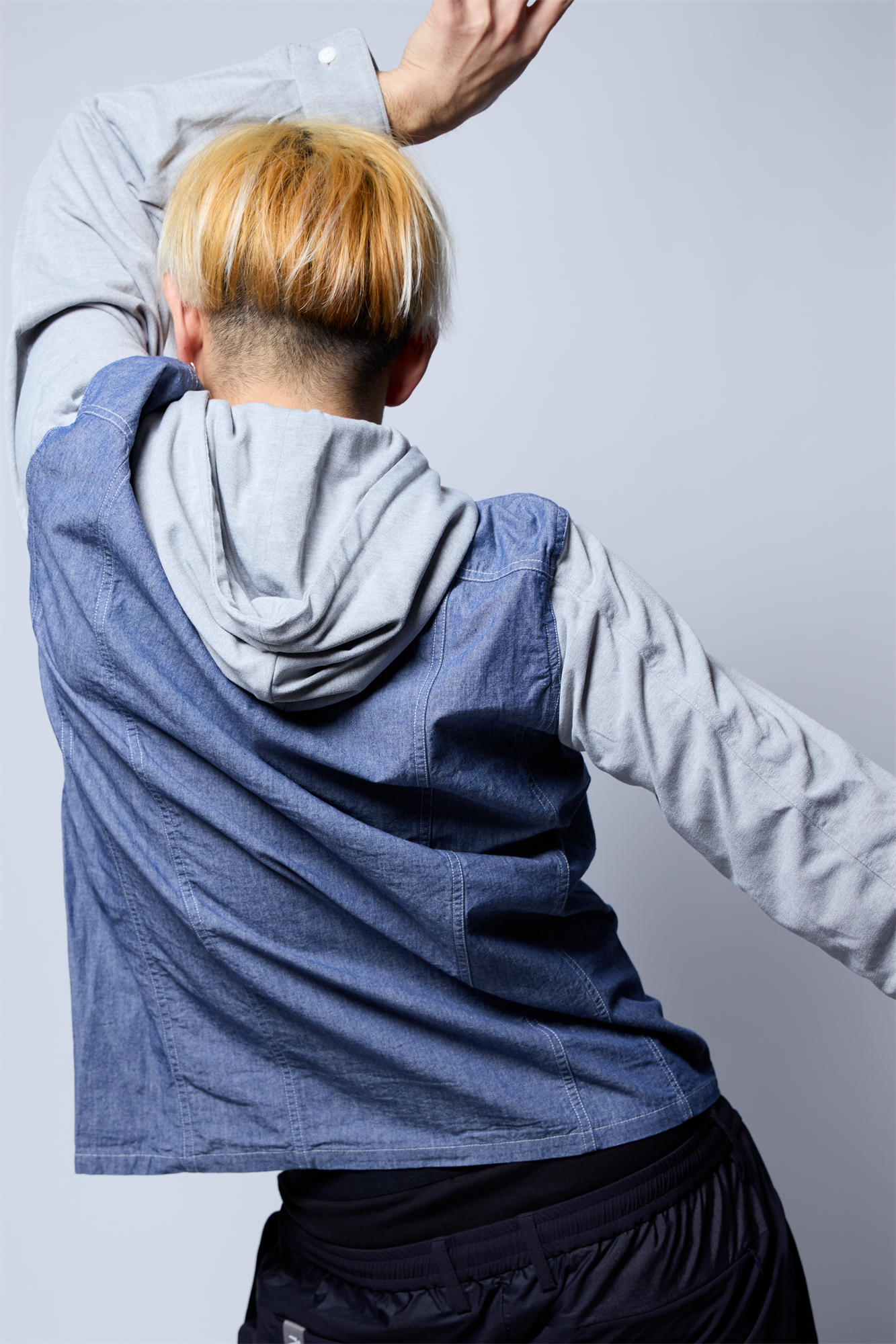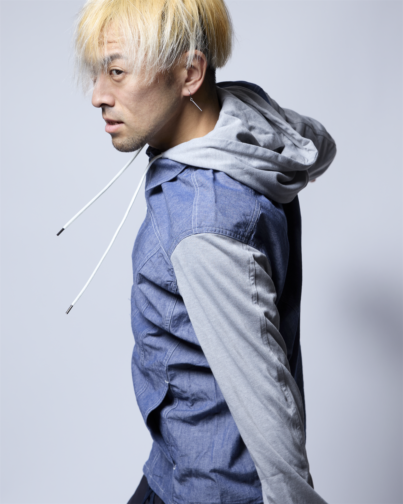 そのダンガリー素材に、フードと袖をジャージで切り換えた異素材ミックスの新感覚なデザインのフーディーとなっています。