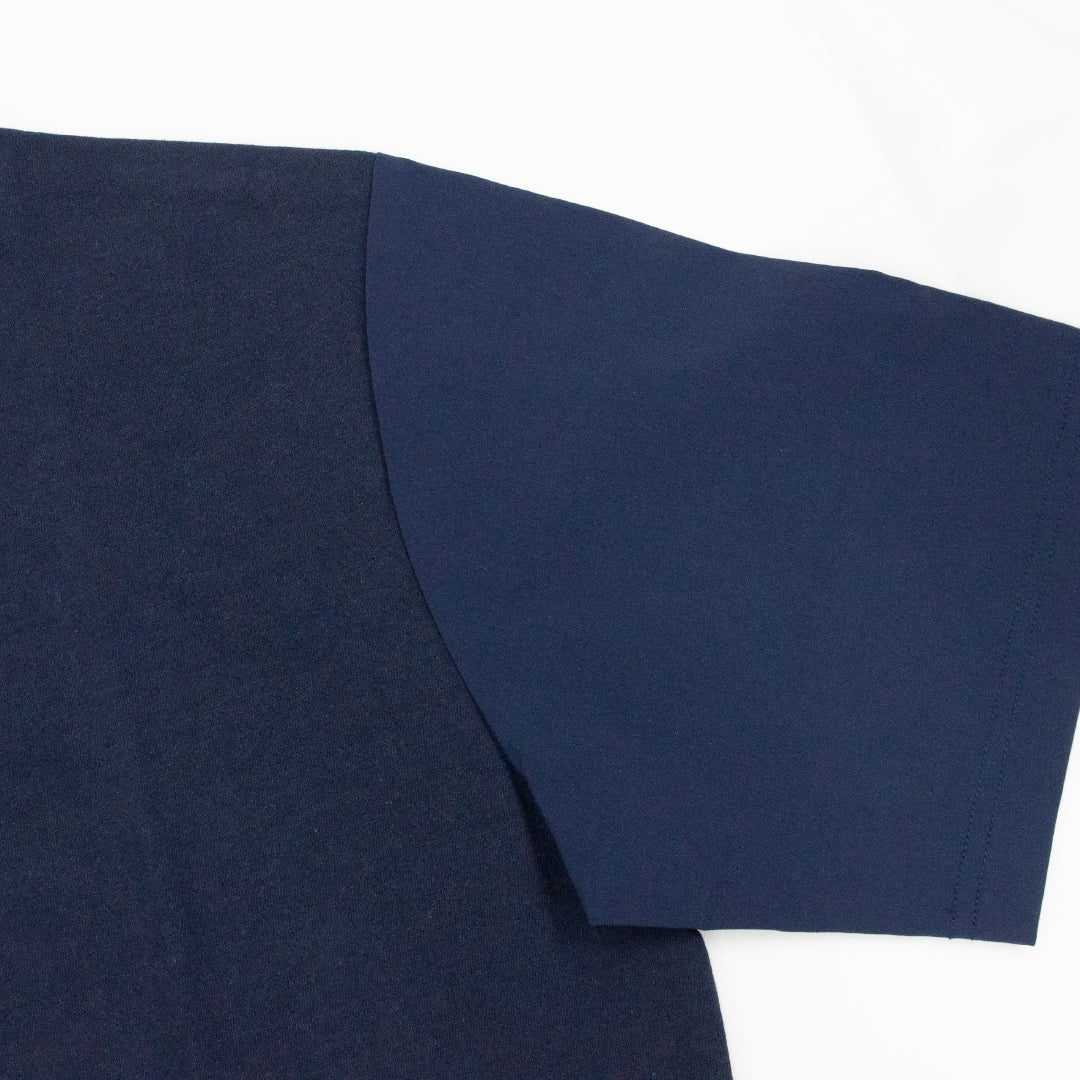 表地は薄い生地ですが、適度なハリコシもあり、表面がきれいな天竺素材が主素材(吸水速乾機能もあり)で、後身頃と袖はナイロン混の布帛で切り換えた異素材ミックスTシャツ。