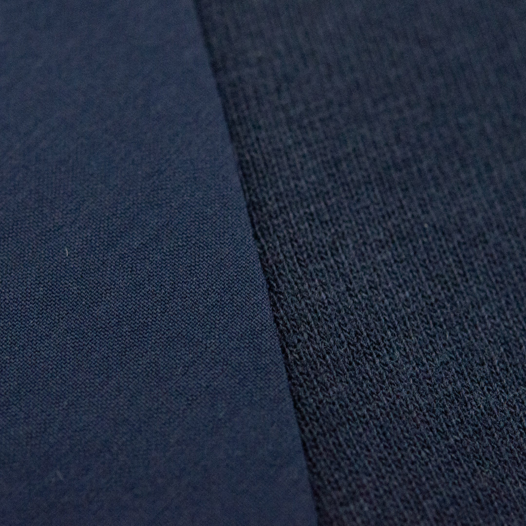 上からジャケットやブルゾン等羽織っていただきましたら、無地のインナーとしても着ていただけて、また脱いだら立体的に切り換えられた布帛部が覗くデザインにしていることで、一枚着としてもしっかり着用いただけます。