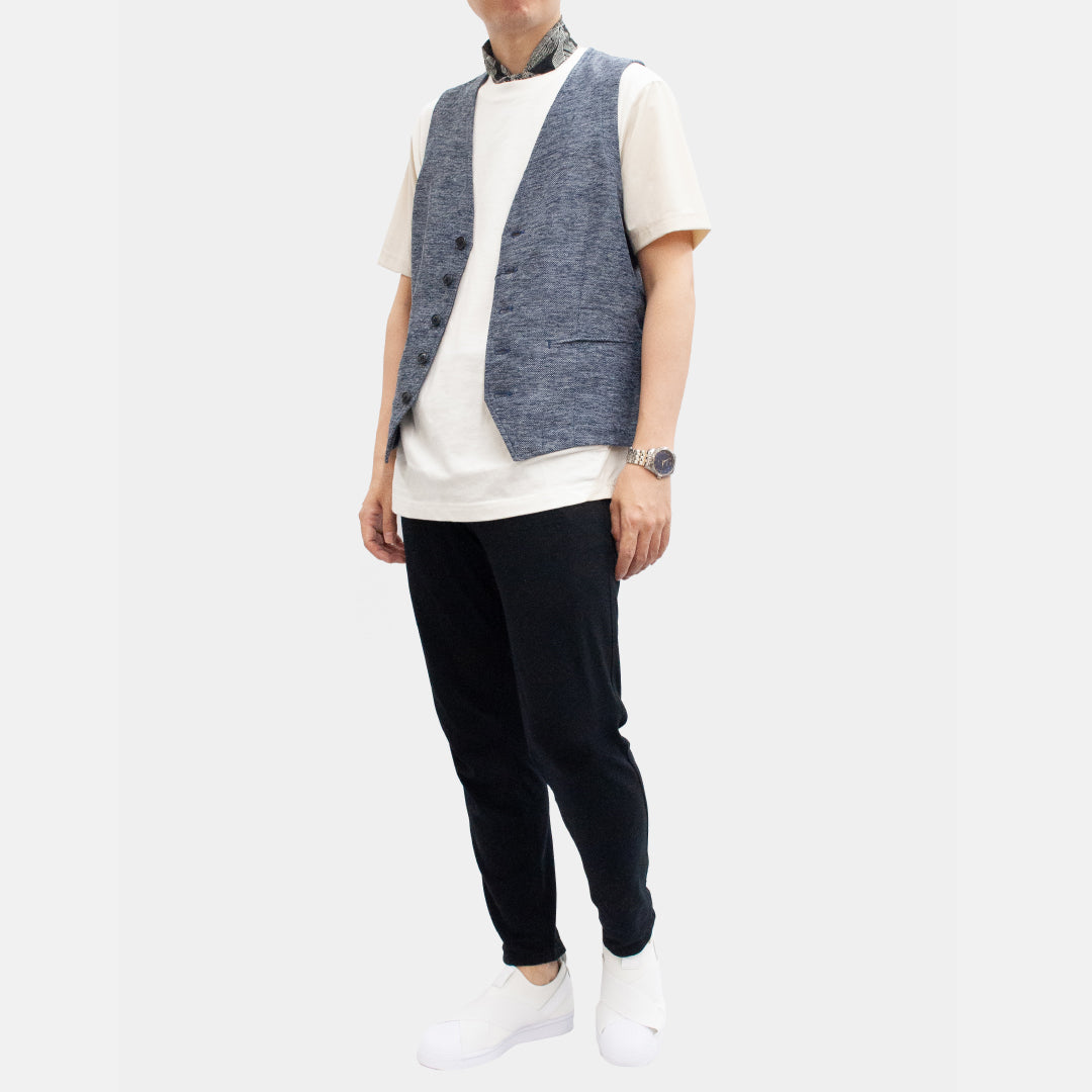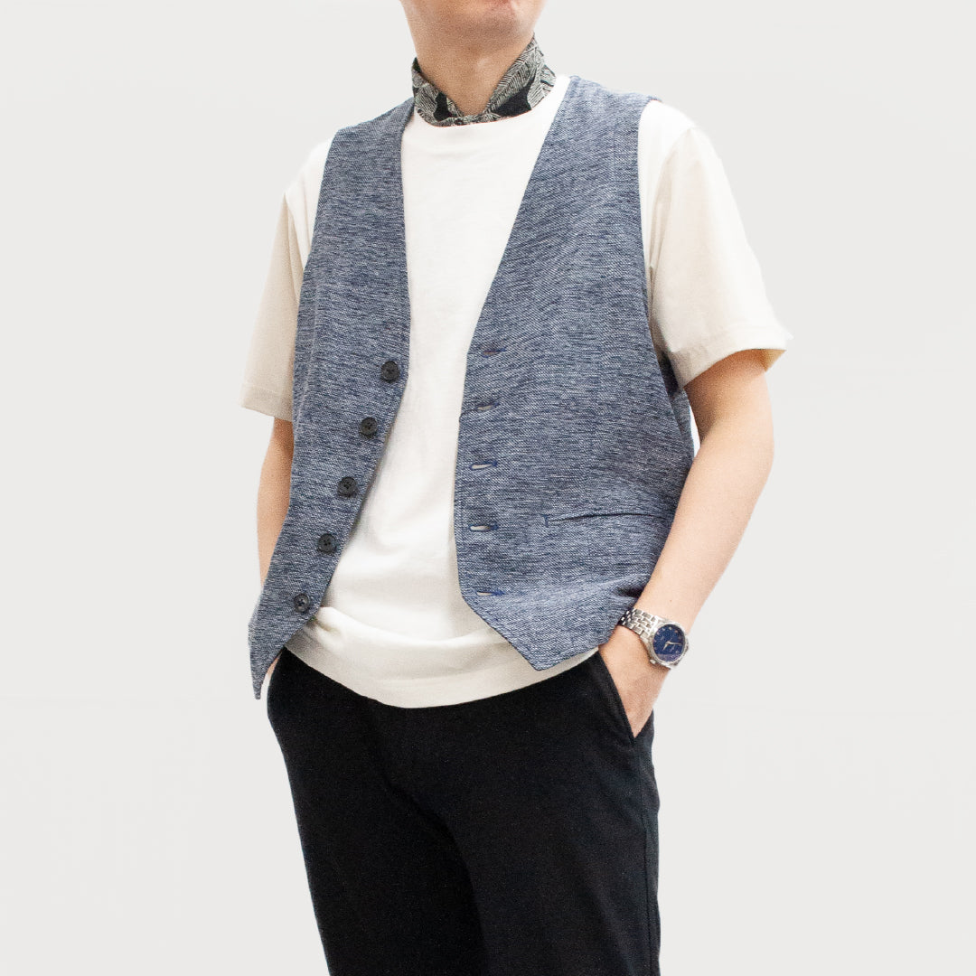 その生地は軽さ、通気性、ストレッチ、シワになりにくい等といった特性を持っており、春夏シーズンに最適な素材を使用したベスト。